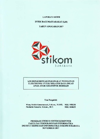 Kusumawati, Weny Indah and Susanto, Pauladie (2017) LPM : IbM Implemantasi Perangkat Permainan Elektronik untuk Melatih Daya Ingat Anak - Anak Kelompok Bermain. Project Report. Penelitian dan Pengembangan Stikom Surabaya, Surabaya.